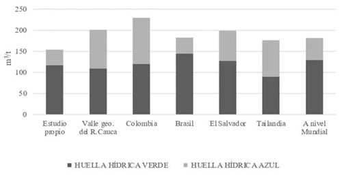 Acorde con la información reportada en la Figura 1, la huella hídrica total para el cultivo de caña de azúcar orgánica fue de 155 m3/t, inferior a los reportes de investigaciones realizadas en caña de azúcar (en condiciones no orgánicas), como lo obtenido para Colombia por Restrepo 8 y Gerbens-Leenes et al. 43 con 201 m3/t y 240 m3/t respectivamente; también se encuentra por debajo de los resultados reportados para Brasil con 201 m3/t(45) , El Salvador 203 m3/t 44, Tailandia 202 m3/t 46 y el promedio mundial con 197 m3/t 42.