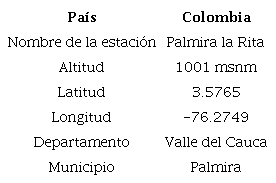 El análisis de la huella hídrica verde y azul de la producción de caña de azúcar (Saccharum officinarum) orgánica se realizó para un área cultivada de 621,5 hectáreas, ubicadas sobre la zona centro del departamento del Valle del Cauca, en la cuenca hidrográfica del rio Amaime, en Colombia. Así mismo, la recolección de información de las variables hidroclimatológicas que se tuvieron en cuenta en el presente estudio se obtuvieron de la estación meteorológica Palmira- La Rita, para el periodo vegetativo del cultivo de 13 meses (ver Tabla 1).