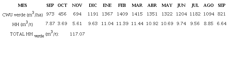 Los requerimientos de agua azul (CWU azul), se obtuvieron a partir del cálculo requerimientos de riego, el cual se consigue de la diferencia entre las precipitaciones efectivas y la evapotranspiración del cultivo.