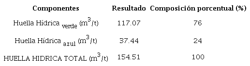 La huella hídrica total del proceso (HH, proc) se determinó a partir de la sumatoria de los componentes verde y azul, en unidad de volumen por unidad de masa (m3/tonelada), de la siguiente forma (ver Ec.(1)):