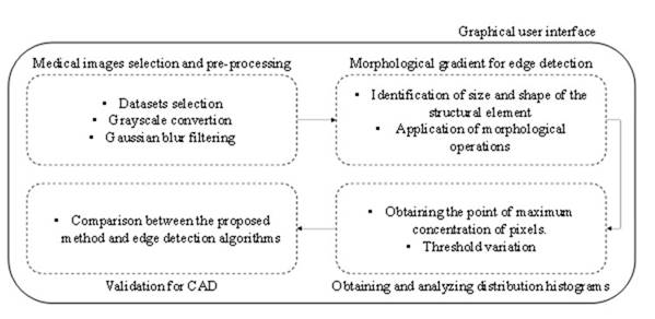 Figure 1 summarizes the methodology proposed for the research development. In the first stage, the medical images to be used are selected and preprocessing stages are applied by conversion to grayscale and Gaussian smoothing filtering. In the second stage, the gradient morphological filter is used for edge detection by implementing morphological operations accompanied by a structural element. Likewise, in the third stage, pixel distribution histograms are obtained, emphasizing the histogram peaks and defining a threshold variation. Finally, in the fourth stage, the developed method is validated for its implementation in a CAD system by comparing it with algorithms for edge detection. For the implementation of the processing system, a graphical user interface is developed.