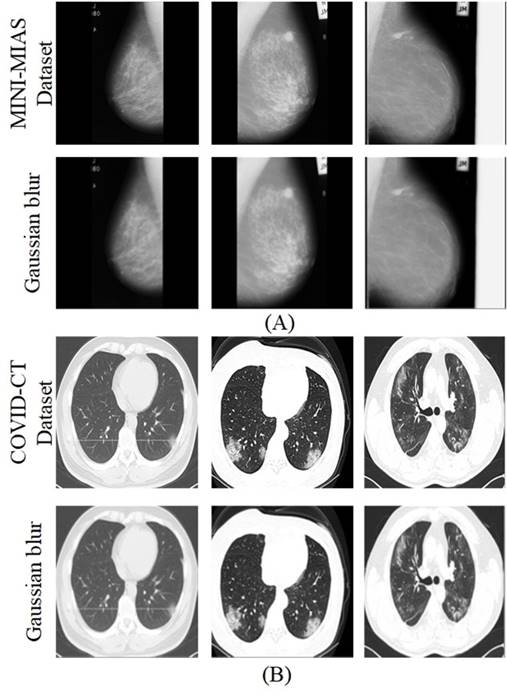 The first two rows present the images from the MINI MIAS dataset of mammograms with the Gaussian blur filtering process respectively, while the last two rows present the images from the COVID-CT dataset of chest computed tomography with the Gaussian blur filtering. As mentioned, for the image format the mammograms did not require grayscale conversion, while for the CT scans grayscale conversion was applied before the Gaussian filtering process.