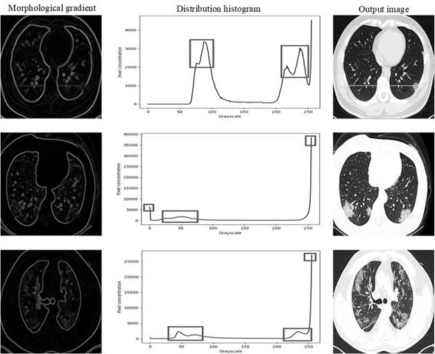 In addition, a morphological gradient filtering process is applied to the Chest CT scans and the concentration histogram is obtained. This is presented in Figure 4. These images show a tendency towards a white hue in the pixels, since the pronounced and relevant peaks were found in the pixels close to 255. Unlike the MINI MIAS Dataset images, the COVID-CT Dataset images do not present any significant filling, so they do not require special treatment to obtain the pixel concentration histogram. In general terms, CT images presented characteristics that generate the threshold value to be in a wider range and not uniform as in the case of mammograms. For CT, the first representative peak is selected and is found between T=50 and T=70, since the peaks found in the sections with T>200 tend to present the background of the image.