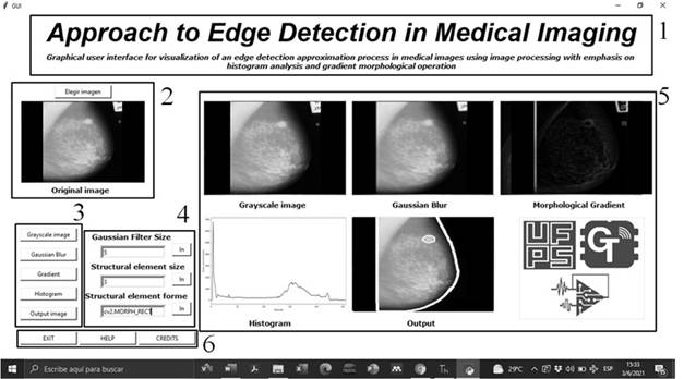 Figure 6 shows the graphical interface developed. Box 1 shows the title and presentation of the interface. Box 2 shows the button for image loading and visualization. Box 3 shows the buttons for activating the processing steps, while Box 4 shows the spaces for loading the sizes and shapes of the masks for the filters and structural elements. Similarly, box 5 shows the visualization of the processing steps, while box 6 illustrates the help button with information for the use of the graphical user interface.