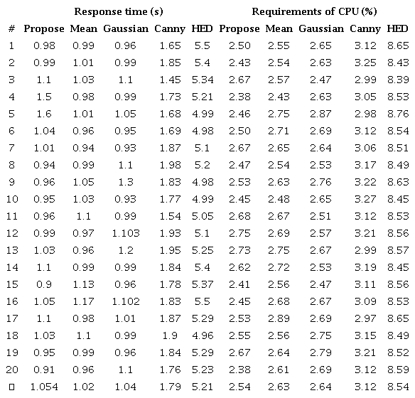 In addition, Table 1 shows the comparison of the techniques with respect to response time and CPU requirements, considering that computer-aided diagnosis processes are generated under a processing system. The values used for comparison were chosen randomly from the sample of images used from each dataset. The proposed method presents the third-best average response time with 1.054 seconds, surpassed by the mean thresholding and Gaussian thresholding method by 0.034 seconds and 0.014 seconds. Also, the proposed method is 1.7 and 4.9 times faster than the Canny algorithm and the HED algorithm. In addition, the proposed method is the one that showed the lowest CPU requirement, with an average requirement of 2.54 %, improving to the mean thresholding method and the Gaussian thresholding that required 2.63 % and 2.64 % of the CPU. In addition, the developed method required 1.22 and 3.36 times less of the central processing unit with respect to the Canny algorithm and the HED algorithm respectively.