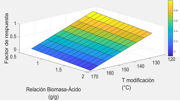 Para observar el efecto de las variables de temperatura de modificación y la relación de biomasa:ácido sobre el porcentaje de remoción, se realizó una curva de superficie de respuesta (Figura 1). Se observa que existe un pico en las coordenadas 127°C y relación 1:1.5 donde se obtiene un valor de 99.954% de colorante removido, sin embargo, en las coordenadas 127°C y relación 1:1, se obtiene un valor muy similar de remoción, 99.946%.
