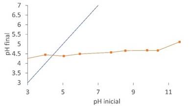 El punto de carga cero indica el pH donde la superficie del adsorbente adquiere una carga neutra. Esto quiere decir que, si el adsorbente se encuentra en una solución con pH mayor al punto de carga cero, su superficie será negativa, atrayendo iones de carga positiva de la solución; de igual manera si el pH es menor, su superficie será positiva y atraerá iones de carga negativa. En la Figura 3, se observa que la curva interseca la diagonal en un valor cercano a 4.38, el cual corresponde al punto de carga cero.