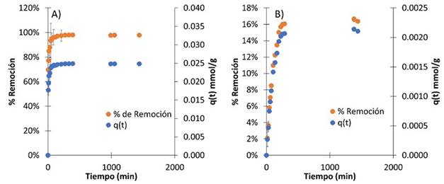 Se puede evidenciar que el equilibrio en la remoción con el colorante violeta de metilo se alcanza a los 330 min, llegando a valores cercanos a lo 98 % de remoción y 0.0249 mmol/g (9.810 mg/g) de capacidad de adsorción. Cabe anotar que a partir de los 45 min ya se obtienen remociones superiores al 93 % y después de 150 min superiores al 97 %, lo que significa un buen rendimiento en menor cantidad de tiempo. Por el contrario, los valores obtenidos con el azul brillante no son muy buenos, ya que se obtuvieron valores inferiores al 17% en cuanto a porcentaje de remoción y una capacidad máxima de remoción de 0.00214 mmol/g (1.70 mg/g) en 23 horas, la cual es 10 veces inferior a la obtenida en la remoción del violeta de metilo.