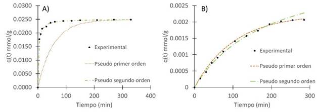 Donde, 𝑞𝑒𝑞 cantidad de adsorbente en el equilibrio (𝑚𝑚𝑜𝑙/𝑔), 𝑞(𝑡) cantidad de adsorbente en el tiempo t (min), y 𝑘1 la constante de cinética (𝑚𝑖𝑛-1).