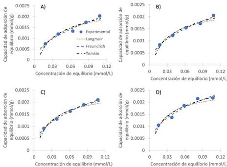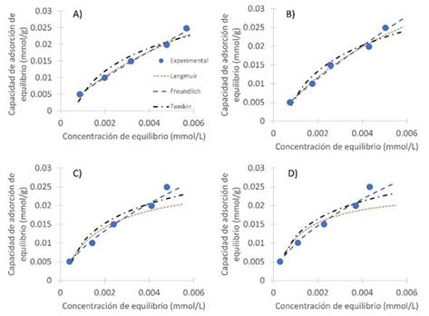 En la Figura 6 y 7 se observa el ajuste de las isotermas de Langmuir, Freundlich y Temkin a la curva experimental en la adsorción de cada colorante. En ellas se puede constatar la cercanía de cada uno de los modelos a los datos experimentales, confirmando además el ajuste que se obtuvo con cada uno ellos.