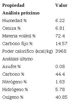 La composición de la biomasa se determinó a través de los análisis próximo y último. El análisis próximo proporciona el contenido de humedad (ASTM D3302), materia volátil (ASTM D3175), ceniza (ASTM D3174) y carbono fijo (ASTM D3172). El análisis último sirve para evaluar la constitución elemental de una muestra. Para esto se siguió la norma ASTM D3176 (1974), donde se incluyen la determinación del hidrógeno, nitrógeno, azufre, ceniza y el cálculo de oxígeno.