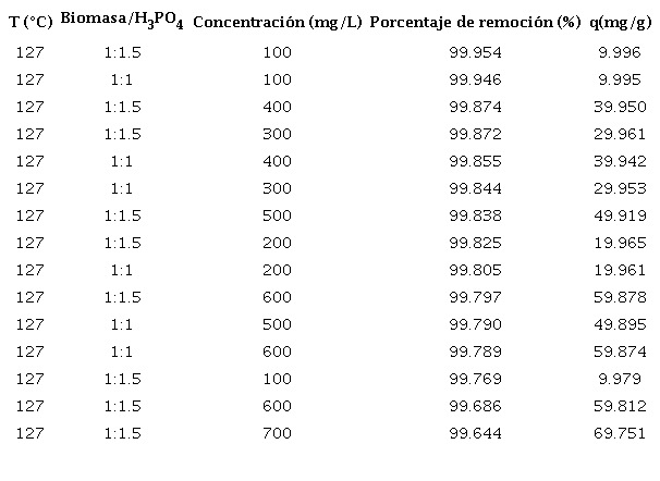 Para seleccionar la relacion biomasa:ácido óptima usada en la modificación de la cáscara de yuca, se analizaron los resultados obtenidos en la remoción de azul de metileno utilizando los lotes de cáscara de yuca modificada a 127 °C. En la Tabla 2 se muestran los porcentajes de remoción obtenidos para cada ensayo y se puede evidenciar que el valor más alto se obtiene con una relacion de 1:1.5, sin embargo, en este trabajo se seleccionó la relación 1:1 ya que con esta, se utiliza menor cantidad de ácido y los resultados obtenidos con este lote, son muy parecidos a los obtenidos con la relacion 1:1.5 (Tabla 2) . De esta forma no sólo obtenemos una buena remoción, sino que también se ahorran recursos ya que se disminuye en un 33 % el consumo de ácido fosfórico usado en la modificación de la cáscara de yuca.