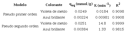 En la Tabla 3 se muestran los parámetros calculados para cada modelo cinético y el ajuste de cada uno de ellos a los datos experimentales. Los coeficientes de correlación muestran que el modelo de pseudo primer orden ajusta mejor para la adsorción de azul brillante, sugiriendo un proceso de adsorción física, mientras que el modelo de pseudo segundo orden ajusta mejor los datos de la adsorción de violeta de metilo, sugiriendo en este caso una adsorción más fuerte, de tipo químico. Estos resultados contrastan con los reportados en otras investigaciones, donde se utilizaron borra de café y corteza de naranja para remover azul brillante, obteniéndose un mejor ajuste con el modelo de pseudo segundo orden 5. En el caso de la adsorción de violeta de metilo sobre carbón activado a partir de cáscara de coco 33, los resultados concuerdan con los obtenidos en nuestro trabajo, observándose un mejor ajuste utilizando el modelo de pseudo segundo orden.