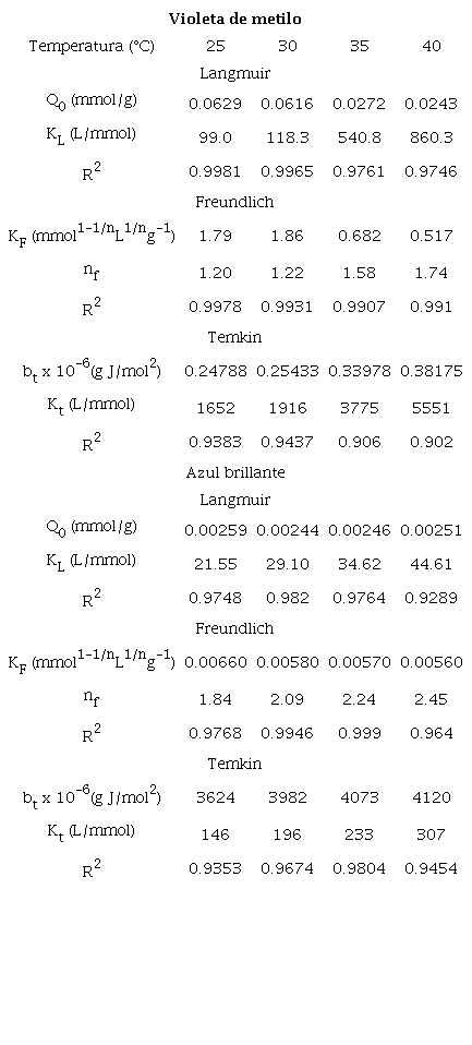 Cabe resaltar que también se obtiene un buen ajuste a los datos experimentales con la isoterma de Langmuir, ya que los valores de R2 son superiores a 0.9289 en la remoción del azul brillante y 0.9756 para el violeta de metilo; además en el caso de la remoción del violeta de metilo a 25 y 30 °C se obtiene un mejor ajuste usando este modelo de isoterma. El buen ajuste a los modelos de Freundlich y Langmuir muestra que cualquiera de los dos puede utilizarse para describir los resultados de las isotermas de adsorción 34.