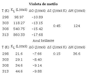 Los valores de energía libre de Gibbs fueron negativos para la adsorción del violeta de metilo y el azul brillante, lo que significa que el proceso es espontáneo y se favorece al aumentar la temperatura. Los valores positivos de la entalpía indican que ambos procesos son de naturaleza endotérmica, además se confirma el predominio de la adsorción química ya que los valores obtenidos están por encima de 20 kJ/mol. Los valores positivos del cambio de entropía, indica la probabilidad de que se presente reversibilidad en el proceso.