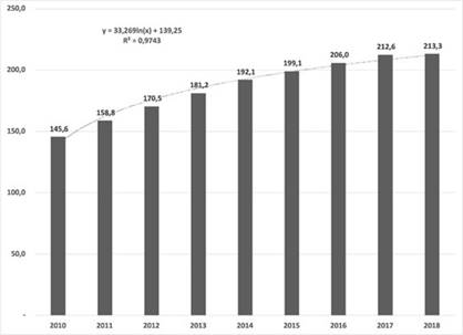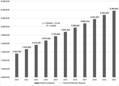 En la Figura 1 se presenta el crecimiento poblacional y la regresión lineal estimada, en la cual se obtuvo un crecimiento anual de 101.664 habitantes con un R2 de 0,99995.