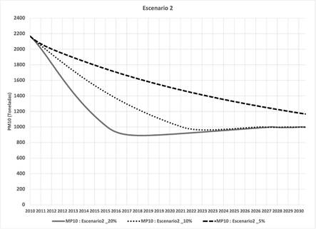 Para la %TC de 5%, los efectos son lentos para el sistema, que a pesar de alcanzar el límite de 1500 Ton/año en el año 2.021, solo logra estabilizar su comportamiento para el año 2.018. Para los casos de %Tc de 20% y 10%, alcanzan la meta de PM10 acumulado en 3 años (2013) y 6 años (2016), respectivamente. Sin embargo, los cambios rápidos en la reducción del contaminante hacen que el sobre-impulso máximo esté por debajo de la meta de PM10 máx. El tiempo de establecimiento en la meta es de 11 (2021) años para ambos casos de %TC del 10% y el %TC de 20. Ambos escenarios son convenientes en la reducción a mediano y largo plazo de PM10, ya que en menos de 6 años se logra reducir la contaminación ambiental en el 25% aproximado y logra estabilizarse en el año 11 (2021), establecido por parte de la política establecida para este escenario. Aunque las 2 %TC de 10% y 20% son viables en su implementación, la %TC del 10% es la más adecuada, debido a que su implantación es más viable por los costos asociados a esta que son inferiores a la %TC del 20%, como ya se había explicado.