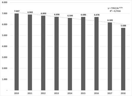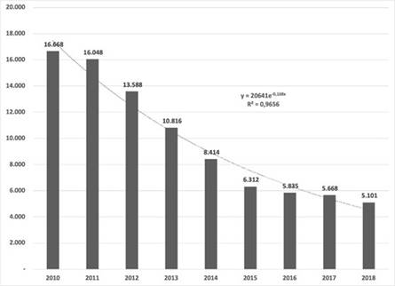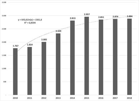 Para el transporte de carga solo fue posible obtener los datos del 2018 que se pueden ver en la Tabla 1. Con estos datos es posible calcular la relación vehículos x cada 1.000 habitantes, la cual es de 8,2.
