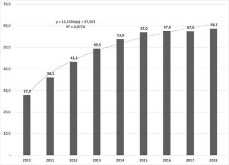 En la Figura 6, se presenta la relación de motocicletas por cada 1.000 habitantes. También en la la Figura 6 se presenta la ecuación de regresión, la cual se hizo con una regresión logarítmica con un R2 de 0,9773.