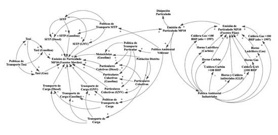 Tomando en consideración el crecimiento poblacional y cada una de las fuentes fijas y móviles, y la afectación de estas en la calidad del aire en la ciudad de Bogotá por PM10, se planteó el diagrama causal mostrado en la Figura 7. El diagrama causal se puede dividir en dos partes: contaminación por Fuentes Móviles en la parte izquierda y contaminación por Fuentes Fijas en la parte derecha.