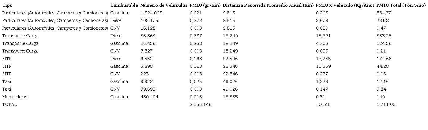 En la Tabla 1 se puede observar el número de vehículos por cada categoría y combustible que utiliza. También se presenta el factor de emisión de partículas PM10 en función de gramos (g/km) generados por kilómetro recorrido, según la clasificación. Es posible estimar las emisiones de PM10 totales a causa de cada tipo de fuente móvil contaminante, de acuerdo a la Ec. (1).