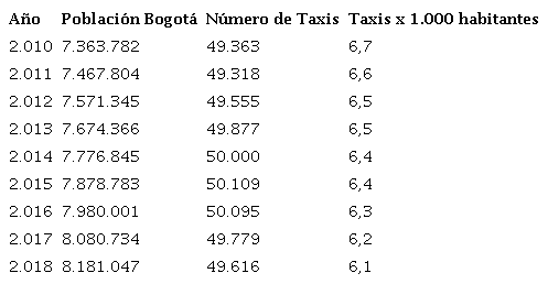 Para los taxis se revisa los cupos de estos, los cuales se han mantenido constantes desde el año 2010, como se observa en la Tabla 2. Pequeñas variaciones alrededor de 50 mil, se han dado en la última década, lo cual permite determinar que la relación de taxis por 1.000 habitantes va disminuyendo en el orden de una décima a causa de que hay más habitantes en la ciudad con el mismo número de taxis.