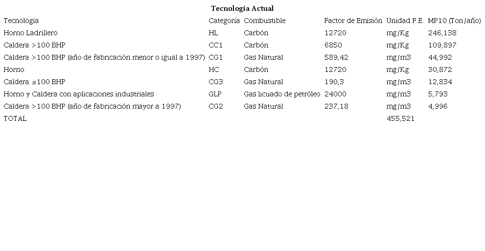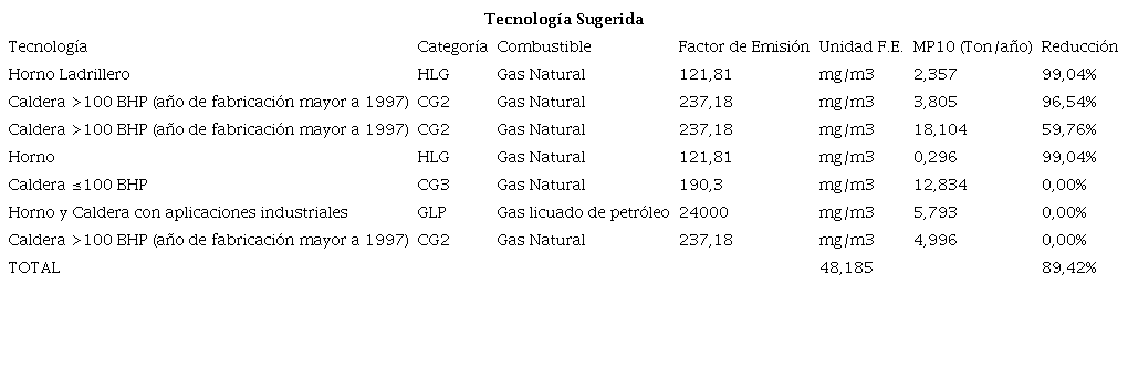Como se observa en la Tabla 3 los hornos y calderas que usan como combustible carbón son los que más contaminan. Pero las calderas a gas natural anteriores a 1997 también contaminan significativamente el ambiente. Por lo cual, para reducir la contaminación de fuente fijas industriales es necesario realizar una actualización tecnológica, donde los hornos y calderas que usan carbón se reemplacen por fuentes que usen gas natural. También se deben cambiar por unas nuevas la caldera que sean anteriores al 1997. Este hecho origino el planteamiento a futuro de la migración a fuentes fijas más limpias, como las consideradas en la Tabla 4.