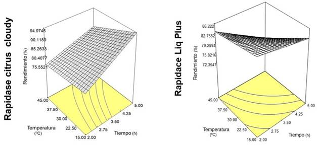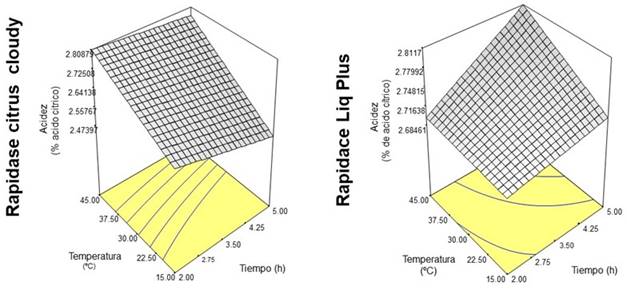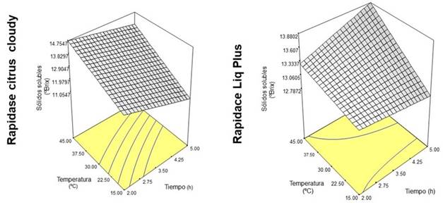 El tratamiento enzimático aumenta el contenido de sólidos solubles totales (SST) de jugo de diversas frutas. La Tabla 3 muestra que el contenido de SST del jugo osciló entre 8.30 y 14.25 °Brix, siendo el valor más alto con la mezcla de enzimas, a 45 °C y 2 h de incubación; lo cual está relacionado con un mayor grado de degradación de los tejidos, que liberan más compuestos como azúcares y ácidos 9 y la presencia de varias enzimas en diferentes combinaciones aumenta el contenido de SST del jugo 25. Singh et al. 27 utilizaron una mezcla de enzimas (Pectinex Ultra SP. L, Celluclast y Rapidase C. PE) para la licuefacción enzimática del jugo de mango por 2 h a 40 °C. El contenido de SST final (15.4 °Brix) del jugo de mango fue mayor comparado con el contenido de SST inicial (14.4 °Brix) del proceso. En la Figura 2, se presenta el efecto de la interacción de la temperatura y tiempo de incubación sobre el contenido de SST con la preparación enzimática Rapidase® LIQ Plus y Rapidase® Citrus Cloudy. Con la primera enzima, se encontró el mayor contenido de SST a alta temperatura (45 °C) y tiempo de incubación (5 h), tiempo superior al sugerido por la casa comercial quien reporta hasta 3 horas de acción, a temperatura entre 10 y 55 °C y que están altamente influenciadas por las condiciones bioquímicas de la pulpa. De forma similar, el máximo contenido de SST utilizando Rapidase® Citrus Cloudy se alcanzó al mismo nivel de temperatura, siendo un factor determinante en la velocidad de reacción. Sin embargo, las fluctuaciones térmicas y temperaturas fuera del rango tolerable de las enzimas, puede afectar los enlaces químicos en el sitio activo y evitar la unión con los sustratos. No obstante, el mejor tiempo de incubación fue de 2 h. Los resultados muestran que la temperatura de 45 °C provocó un aumento del contenido de SST en todos los tratamientos enzimáticos. También, el tiempo de incubación fue importante en el proceso de licuefacción enzimática. Sin embargo, el comportamiento varió según el preparado enzimático, debido al tipo de enzimas presente en cada uno y la especificidad del sitio activo para unirse con la molécula objetivo del sustrato 9).