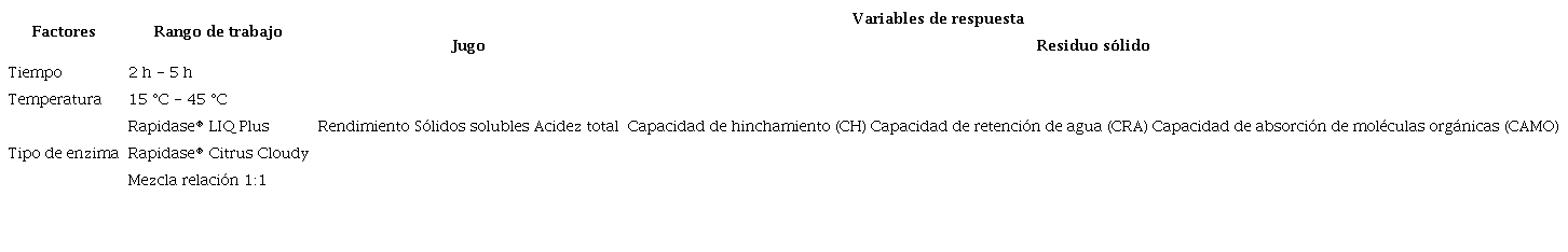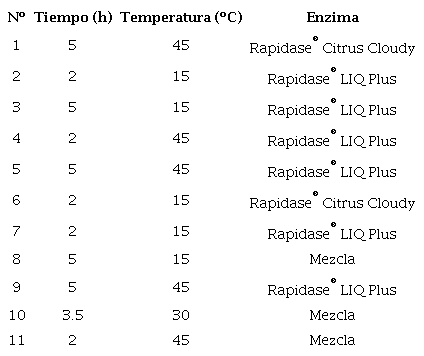 Las enzimas pectinolíticas comerciales estudiadas fueron Rapidase® LIQ Plus (pectinasa, celulasa y hemicelulasa) y Rapidase® Citrus Cloudy (pectinasa) de DSM (Países Bajos). Se tomaron 320 g de pulpa de copoazú que fue mezclada con una cantidad determinada de enzima en la misma proporción (0.02 % p/p) por cada tratamiento (Tabla 1). Las muestras se agitaron constantemente variando el tipo de enzima (Rapidase® LIQ Plus y Rapidase® Citrus Cloudy y mezcla de enzimas (Rapidase® LIQ Plus y Rapidase® Citrus Cloudy) en proporción 50:50), tiempo (2, 3.5 y 5 h) y temperatura de incubación (15, 30 y 45 °C). Posteriormente, la enzima se inactivó calentando la suspensión a 90 °C durante 5 min. El jugo obtenido se centrifugó a 10,000 rpm durante 15 min. El sobrenadante se filtró utilizando papel filtro Whatman Nº 1, el jugo filtrado y la fibra, subproductos de la licuefacción se utilizaron para análisis posteriores. Todos los tratamientos se realizaron por triplicado.
