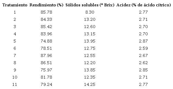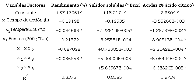 El rendimiento promedio, contenido de sólidos solubles y acidez titulable del jugo de copoazú extraído enzimáticamente se presentan en la Tabla 3. El coeficiente de regresión lineal y los resultados para términos lineales y de interacción se muestran en la Tabla 4. El análisis estadístico reveló que el modelo propuesto fue adecuado, con valores de R2 satisfactorio para todas las respuestas. Los valores de R2 para rendimiento, sólidos solubles y acidez titulable fueron 0.8375, 0.8185 y 0.9734, respectivamente.
