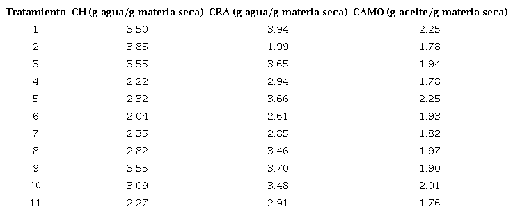 Se define como la cantidad de agua que es retenida por 1 g de fibras secas en condiciones específicas de temperatura, tiempo de remojo y duración y velocidad de centrifugación 29. La CRA alcanzó valores de hasta 3.94 g de agua / g de materia seca para el tratamiento uno, confirmando la calidad de la fibra estudiada. La capacidad de retención de agua se correlaciona con la cantidad de fibra insoluble y con la granulometría de los coproductos 15. El residuo de copoazú presentó un mayor CRA comparado con el trigo duro (1.5 - 2.1 g de agua / g de fibra) 30. La alta capacidad de retención de agua (CRA) de residuos agroindustriales confiere propiedades tecnológicas que permite su utilización como ingredientes para reducir calorías, evitar la sinéresis y modificar la viscosidad y textura de los alimentos formulados 31.
