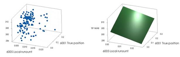 Using Eq. 2 and the R2adjusted value, the engine oil pressure changes 25.8% due to the interaction of the machining. It can be predicted that when the true position of bore #6001 is increased, the pressure rises. On the other hand, when the runout of bore #6005 is increased, the pressure decreases. The statistical model geometrically represents a plane in three-dimensional space and predicts pressure values at different machining conditions (see Figure 10). A pressure value of 306.5 kPa can be predicted (within the range allowed in the engine cold testing) when the true position and the runout are within the limits of their tolerances, which are 300 microns for the true position and 25 microns for the runout.