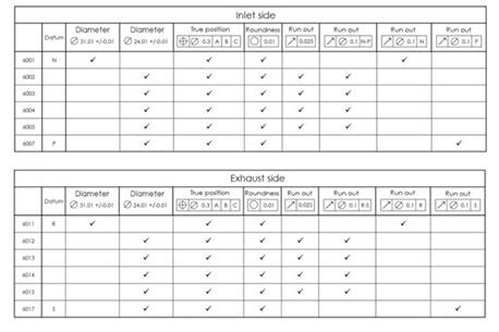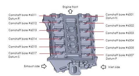 A sample of 124-cylinder heads was taken from the production line, and the heads were dimensioned in a Zeiss Acura coordinate measuring machine (CMM). Subsequently, each head was assembled to an engine to later be diagnosed in a HIRATA engine cold testing, the above was done between the months of July to August 2019 where the production was 81,000 engines (1500 engines per day). The machining characteristics that were measured from each cylinder head were: diameter, the true position, the runout, and the roundness for the 12 bores that assemble the camshafts. Figure 2 shows how the camshaft bores were identified, and Figure 3 shows the design specifications.