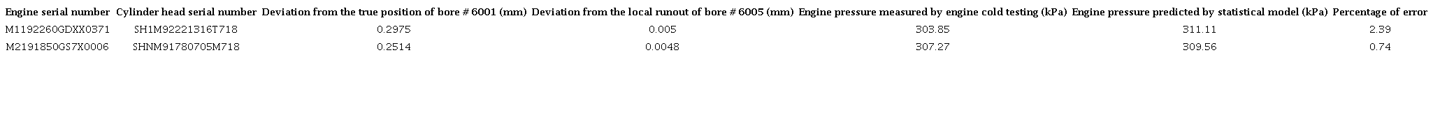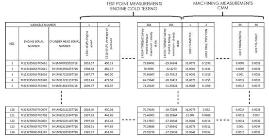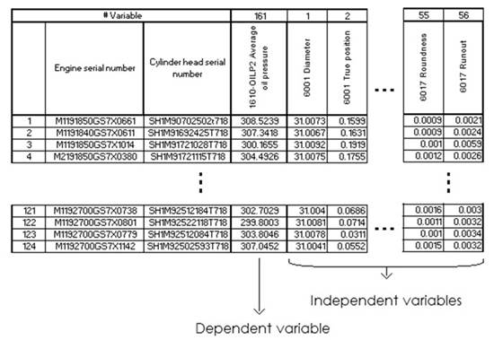 The results of the measurements done by the CMM and the engine cold testing were ordered in a data matrix as illustrated in Figure 7, so that the rows were the 124 individuals in the sample (cylinder heads and engines), and the columns were the 57 variables, one dependent variable (test point #1610) and 56 independent variables (cylinder head characteristics).