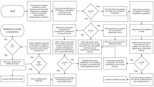 From the 305 test points and using the procedure shown in Figure 5, 77 significant statistical models were determined (25.25%), and 228 were not (74.75%) due to the following reasons: 1.- There was no normality in the residuals (60.66%, 185 Test Points), 2.- there were no significant correlations between the test points and the machining characteristics (13.11%, 40 Test Points) and finally, there were 3 test points that had the same value (.98%).
