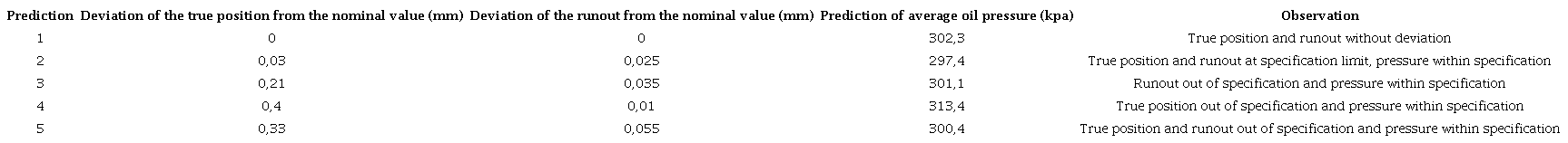 Table 2 shows 5 predictions of oil pressure calculated by the model. In prediction 1 deviations in the machining are not considered, the pressure calculated is only 0.2 kPa less than the nominal value. In prediction 2, deviations in the machining are at the limit of their specifications however the pressure calculated is within its specification and above its lower limit, this situation should not happen. In predictions 3 to 5, the oil pressures are within specification although the dimensional deviations are out of specification, these situations should not happen either.