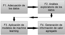 Para el desarrollo de la presente investigación, se tuvieron en cuenta 4 fases metodológicas a saber: adecuación del dataset y limpieza de datos, análisis exploratorio de los datos, aplicación de modelos de machine learning y generación de información de valor agregado (ver Figura 1).