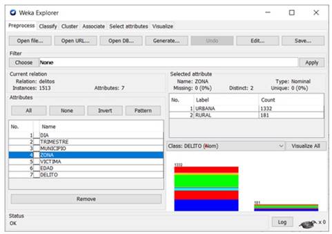 En esta sección se presentan los resultados tanto del estudio exploratorio, como del análisis basado en machine learning, sobre el dataset de delitos cibernéticos para el departamento de Cundinamarca, el cual cuenta con un total de 1513 registros y un total de 7 atributos (día, trimestre, municipio, zona, víctima, edad y delito), los cuales pueden apreciarse de manera más clara en la interfaz de pre-procesamiento de la herramienta de minería de datos weka (ver Figura 2), en la cual es posible realizar un análisis descriptivo sobre cada uno de los atributos del dataset considerado.