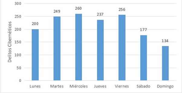 A nivel del estudio exploratorio, es importante mencionar que de acuerdo a los análisis realizados sobre los diferentes atributos del dataset mediante la herramienta Weka, se pudo determinar que los días de la semana en los cuales se cometen con mayor frecuencia los delitos cibernéticos son el miércoles y el viernes, con una frecuencia respectiva de 260 y 256 ocurrencias respectivamente, mientras que los días en los cuales son cometidos con menor frecuencia dichos delitos son el domingo y el sábado con 134 y 177 ocurrencias respectivamente. Lo anterior puede apreciarse de manera más clara en la Figura 3, donde se presentan el número de delitos en cada uno de los días de la semana.