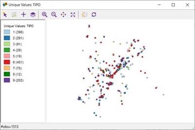 De manera complementaria a los resultados obtenidos anteriormente, mediante el uso de la herramienta libre GeoDa es posible visualizar la distribución de los 9 tipos de delitos cibernéticos del dataset (1. Violación de datos personales, 2. Acceso abusivo a un sistema informático, 3. Interceptación de datos informáticos, 4. Daño informático, 5. Uso de software malicioso, 6. Hurto por medios informáticos y semejantes, 7. Transferencia no consentida de activos, 8. Obstaculización ilegítima de sistema informático o red de telecomunicación y 9. Suplantación de sitios web para capturar datos personales), dentro del departamento de Cundinamarca, tal como se aprecia en la Figura 5. Cabe mencionar que el dataset muestra la distribución de los delitos en los diferentes municipios de Cundinamarca, pero no presenta el mapa con la división geográfica de los mismos.
