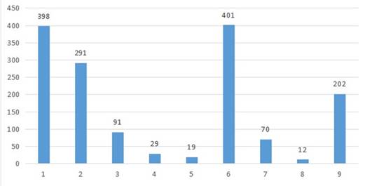 A nivel del tipo de los delitos cometidos dentro del departamento de Cundinamarca, es posible mencionar que los delitos cibernéticos más recurrentes se encuentran en las tipologías: hurto por medios informáticos y violación de datos personales, cada uno de los cuales cuenta con 401 y 398 ocurrencias respectivamente. Del mismo modo, el delito que menos se presenta en el departamento de Cundinamarca fue el de obstaculización ilegítima de sistema informático o red de telecomunicación, con un total de 12 ocurrencias. Teniendo en cuenta lo anterior, en la Figura 6 se presenta el número total de incidencias asociadas a cada una de las 9 tipologías o tipos de delitos presentes en el dataset.