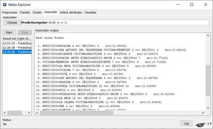 Una vez realizado el análisis exploratorio de los datos, se procedió con la aplicación de modelos de machine learning y de manera específica, los algoritmos de reglas de asociación (PredictiveApriori) y de agrupamiento (KMeans), los cuales no requieren el uso de validación cruzada, ni la discriminación de los datos en conjuntos de entrenamiento y prueba, dado que no son métodos predictivos, como en el caso de los modelos de aprendizaje supervisado. En lo referente al algoritmo de reglas de asociación, se hizo uso de las ventajas provistas por la herramienta Weka para obtener un total de 20 reglas de inferencia, de las cuales se seleccionaron las 5 reglas con un porcentaje de acierto o precisión superior al 70%, tal como se presenta en la Figura 7. Así mismo, se configuró en Weka el parámetro CAR=False para el modelo de reglas de asociación, el cual permite la obtención de reglas que involucran en el antecedente y consecuente los diferentes atributos que componen el dataset.
