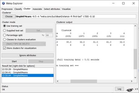 En lo referente a la aplicación de los modelos de agrupamiento, se usaron las funcionalidades de la herramienta Weka para la aplicación del algoritmo KMeans en la obtención de los clusters y centroides de dos modelos (ver Figura 8). El primer modelo tuvo por objetivo relacionar las edades de las víctimas con el tipo de delito cibernético, mientras que el segundo relacionó el municipio con el tipo de delito cibernético.