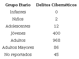 En lo referente a las víctimas de los delitos, 842 son mujeres (55.65%), 661 son hombres (43.69%) y 10 no han sido reportadas (0.66%). Del mismo modo con respecto a las edades de las víctimas de los delitos cibernéticos, cabe mencionar que estas oscilan entre los 5 y los 82 años. Así mismo, si se relacionan los 5 grupos etarios (infantes, niños, adolescentes, jóvenes, adultos y adultos mayores) con las víctimas de los delitos cibernéticos, se obtiene que el grupo etario que tiene el mayor número de víctimas es el de los adultos con 968 ocurrencias y el de los jóvenes con 400 ocurrencias. Lo anterior puede apreciarse de manera más clara en la Tabla 1.