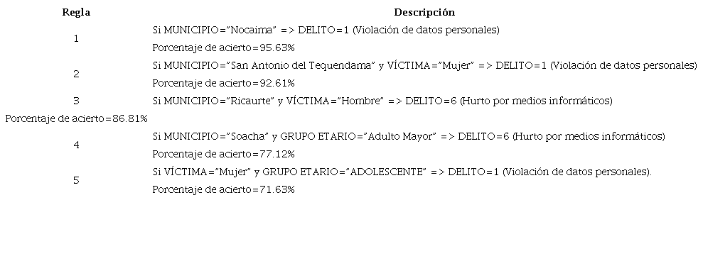 Para la obtención de las reglas de inferencia en mención, fue necesario asegurarse que todos los atributos fueran categóricos, así como determinar el conjunto de los que arrojan mejores reglas, de tal modo que se tuvo en cuenta los atributos: municipio, víctima, grupo etario (obtenido a partir del atributo edad) y delito (correspondiente a los 9 tipos de delitos identificados en el dataset), de tal modo que en la Tabla 2 se presentan las 5 reglas seleccionadas, junto con el porcentaje de acierto. Tal como se aprecia en la Tabla 2, las reglas de asociación obtenidas relacionan el municipio, el grupo etario y el género de la víctima con el tipo de delito.