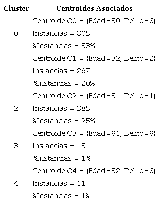 En cuanto a la aplicación del primer modelo, se obtuvieron un total de cinco clusters con sus centroides asociados, los cuales se presentan en la Tabla 3. Se puede apreciar que los clusters con mayor porcentaje de instancias son el 0, el 1 y el 2, permitiendo determinar respectivamente como en su mayoría personas de edades cercanas a los 30 años han sido víctimas de los delitos 6 (hurto por medios informáticos), 2 (Acceso abusivo a un sistema informático) y 1 (violación de datos personales).