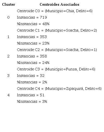 En lo referente a la aplicación del segundo modelo de clustering, se obtuvieron un total de 5 clusters con sus centroides asociados, los cuales son presentados en la Tabla 4. Se puede apreciar que los clusters con mayor porcentaje de instancias son el 0, el 1 y el 2, los cuales permiten determinar como el tipo de delito 6 (Hurto por medios informáticos y semejantes) está concentrado en el municipio de “Chia”, mientras que los delitos tipo 1 (Violación de datos personales) y 2 (Acceso abusivo a un sistema informático) están concentrados en el municipio de “Soacha”.