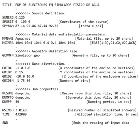 Todas las PDP monoenergéticas utilizaron la misma configuración geométrica y energética, lo único que cambiaba era el valor de la energía nominal en SENERG.