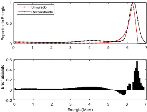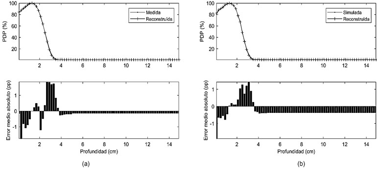 Para una comparación abarcadora se usó el error porcentual medio absoluto (EPMA) entre las PDP reconstruida - medida y reconstruida - simulada, que dio como resultado, 0,33 y 0,53 %, respectivamente. Esto significa que, en general, la PDP reconstruida se ajustó mejor a la PDP medida que a la simulada, consecuentemente se podría decir que, en principio, el espectro reconstruido es más próximo al real (que no se conoce) que al simulado.