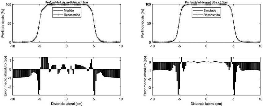 apreciables, una vez que se presentó una buena coincidencia entre las PDP simulada y reconstruida. Respecto a los perfiles de dosis, sucedió algo similar que, para las PDP, el perfil reconstruido se ajustó mejor con el medido que con el simulado. En efecto, el EPMA para los perfiles reconstruido - medido fue de 1.78% (Fig. 4a), mientras que para reconstruido - simulado, 2,12 % (Fig. 4b).